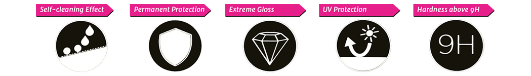 Self-Cleaning Effect, Less Maintenance! The smoothness of coated surfaces does not allow dirt, break dust and tar to stick to your car's paint, wheels or glass. This allows washing your vehicle with less effort and frequency. Waxing is now obsolete.